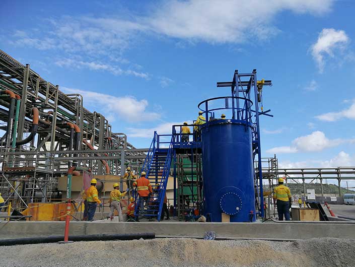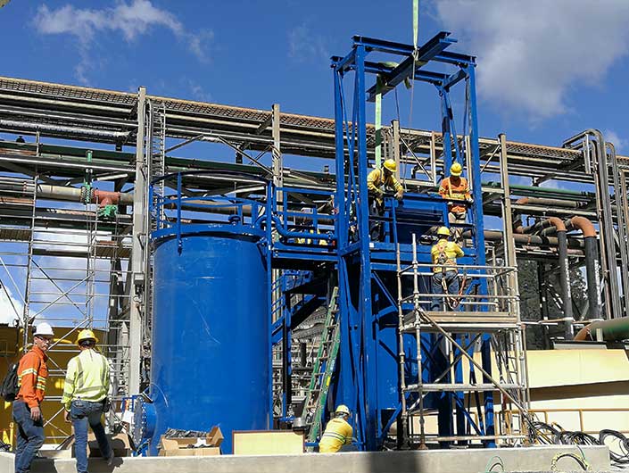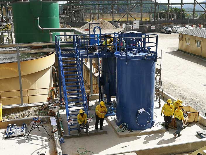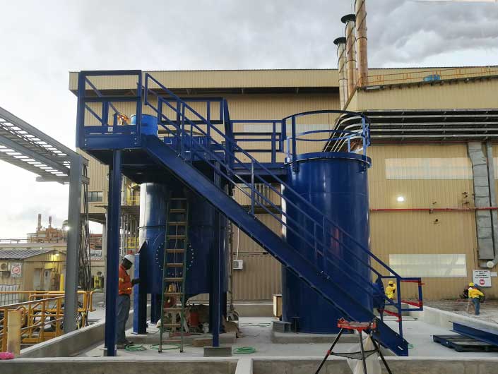 The system features a 2400-gallon (9.1 m3) tank with live xanthate mixing capability for 10-30% solution concentrations. Solutions are transferred to a day tank of 3000 gallons (11.4 m3), from which feed pumps deliver solution to the process. In addition, the supporting structure included a monorail, hoist, stairs, and platforms.
